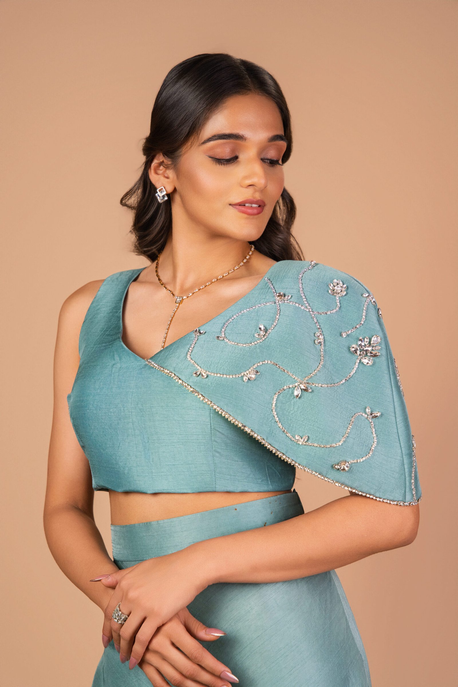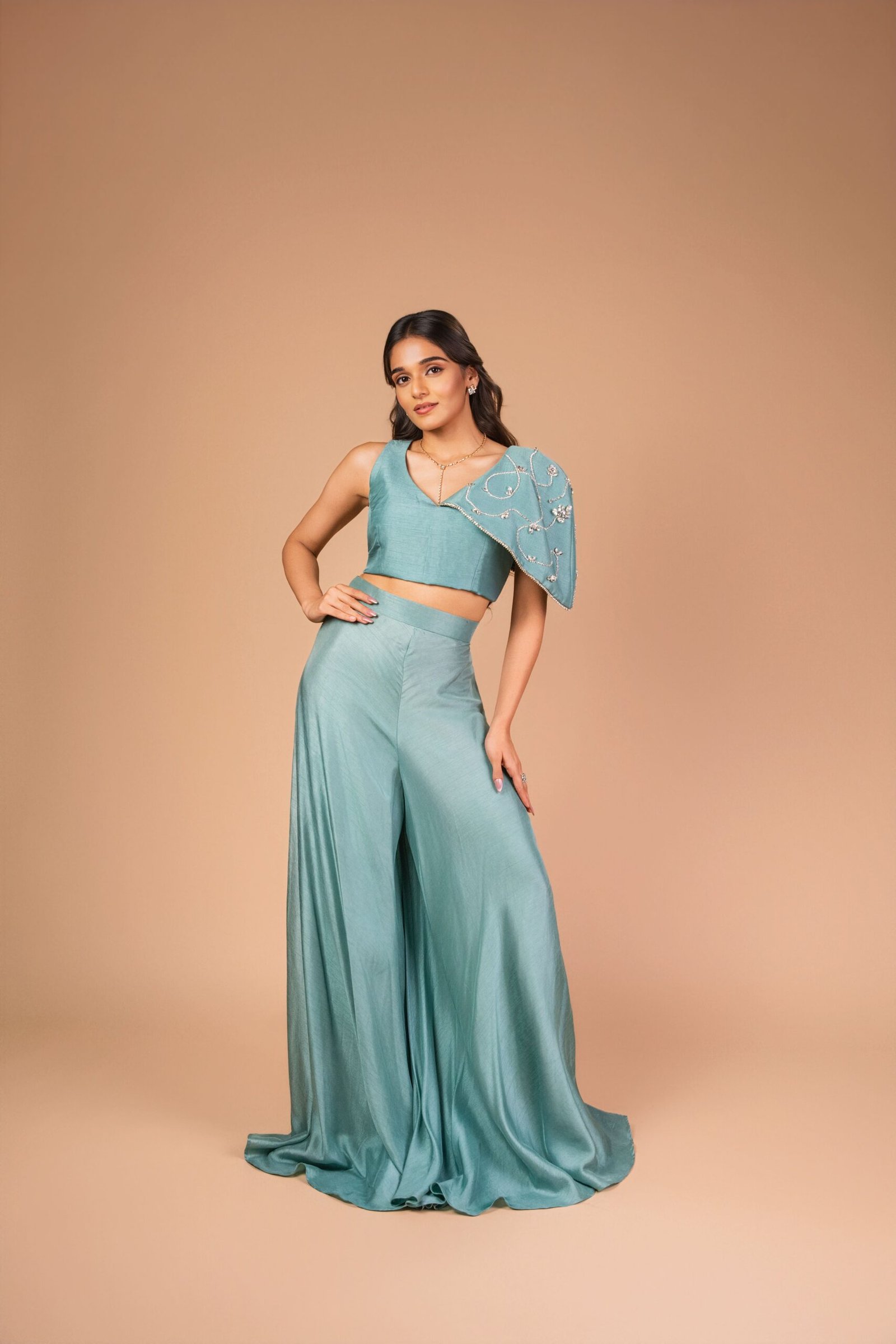 Sea Mist from the Kohinoor Collection is a modern festive co-ord crafted in a serene sea-green tone. The fluid palazzo is paired with a structured crop top highlighted by a statement one-side flap adorned with delicate diamond embellishments. Balancing subtle shimmer with clean silhouettes, this ensemble is ideal for engagements, intimate gatherings, haldi celebrations, and carnival-inspired occasions.